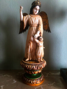 Por tanto en el arte de la eboraria hispano-filipina esta es una pieza excepcionalmente singular y rara por su iconografía del Angel acompañado por un niño.